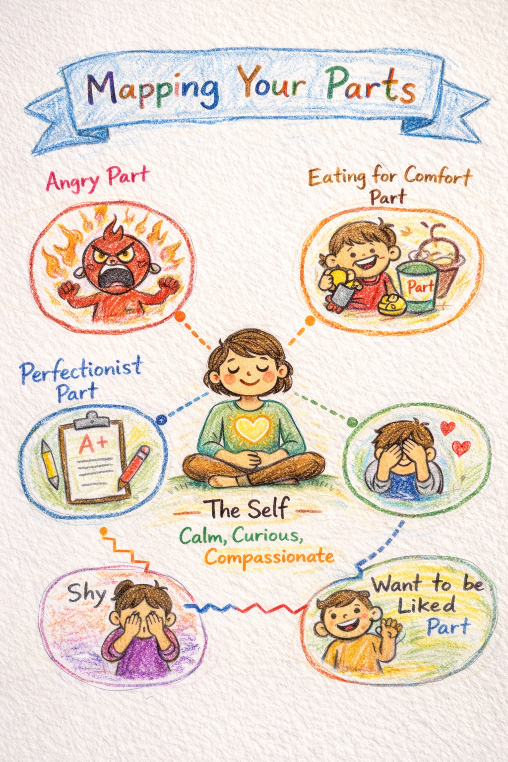 Research across therapies shows that self-awareness, emotional labelling, and compassionate reflection improve regulation and reduce distress. Mapping parts naturally builds these skills.